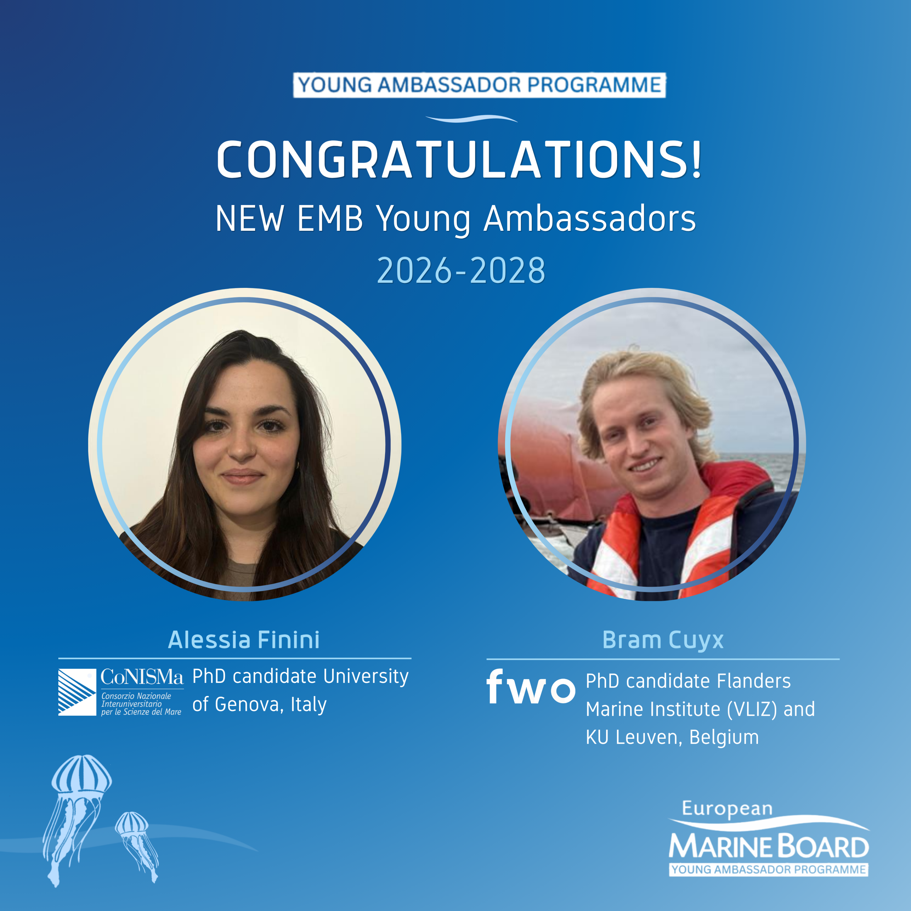 We are delighted to introduce our two new EMB Young Ambassadors! We can now announce that Alessia Finini, a PhD candidate at the University of Genova which is part of the CoNISMa Italian Marine University Consortium, Italy, and Bram Cuyx, a PhD candidate at Flanders Marine Institute (VLIZ) and KU Leuven in Belgium, have been selected! You can find out more about them here. We look forward to working with them.