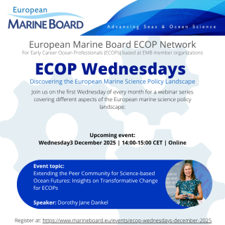 In this edition of the ECOP Wednesdays event series, hosted by the EMB Young Ambassadors and the EMB Secretariat for the EMB ECOP network, Dorothy Jane Dankel, a Senior Researcher at SINTEF Ocean, Norway, spoke about "Extending the Peer Community for Science-based Ocean Futures: Insights on Transformative Change for ECOPs".
