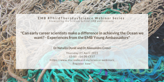 This webinar was on "Can early career scientists make a difference in achieving the Ocean we want? - Experiences from the EMB Young Ambassadors". It featured the research and experiences of the two outgoing EMB Young Ambassadors, Dr Natalija Dunić and Dr Alessandro Cresci, who have served in the role since Spring 2020 and who ended their 2-year term in Spring 2022.