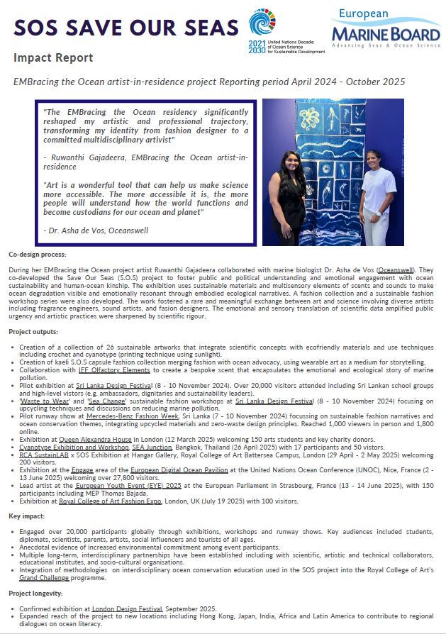Ruwanthi Gajadeera is an award-winning Sri Lankan textile and fashion designer, and a force for creative change in the fashion and textile world. She has unwavering commitment to sustainability with designs acting as a call to action. Ruwanthi's EMBracing the Ocean project, developed in collaboration with marine biologist Dr. Asha de Vos (Oceanswell), culminated in exhibition, fashion collection, and sustainable fashion workshops to make ocean degradation visible and emotionally resonant to increase public and political engagement with ocean sustainability.