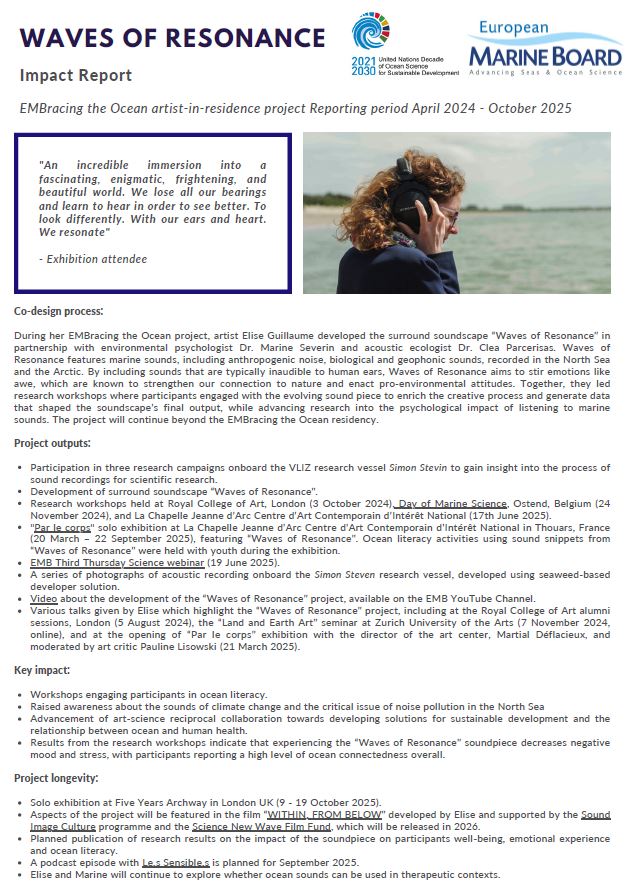 Elise Guillaume is a Belgian artist exploring the interplay of psychology, ecology and notions of care. During her EMBracing the Ocean project, she developed the surround soundscape “Waves of Resonance” in partnership with environmental psychologist Dr. Marine Severin and acoustic ecologist Dr. Clea Parcerisas from Flanders Marine Institute (VLIZ). They led research workshops where participants engaged with the evolving sound piece to enrich the creative process and generate data that shaped the soundscape’s final exhibition output, while advancing research into the psychological impact of listening to marine sounds.