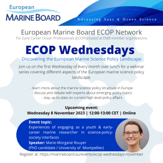 In this edition of the ECOP Wednesdays event series, hosted by the EMB Young Ambassadors and the EMB Secretariat for the EMB ECOP network, Marie Morgane shared her experiences, engaging as a young and early-career marine researcher, mostly through the Global Youth Biodiversity Network, who represents young people in the United Convention on Biological Diversity.