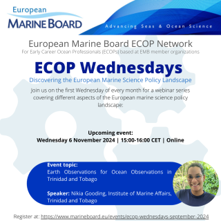 In this edition of the ECOP Wednesdays event series, hosted by the EMB Young Ambassadors and the EMB Secretariat for the EMB ECOP network, Nikia Gooding spoke on the topic of "Earth Observations for Ocean Observations in Trinidad and Tobago".