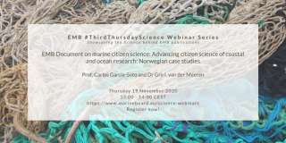 EMB Executive Director Sheila JJ Heymans started off the webinar with a short introduction and then Prof. Carlos Garcia-Soto and Dr. Gro I. van der Meeren discussed their work on this topic, which was included in the EMB Position Paper n°23 on Marine Citizen Science. After the presentations, therewas some time for questions from the participants and a discussion on the topic.